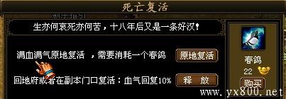 当玩家等级大于20级时,死亡后会出现两个选项,您可以选择使用商城道具春鸽,享受满血满气原地复活;也可以选择去地府或者副本门口复活。