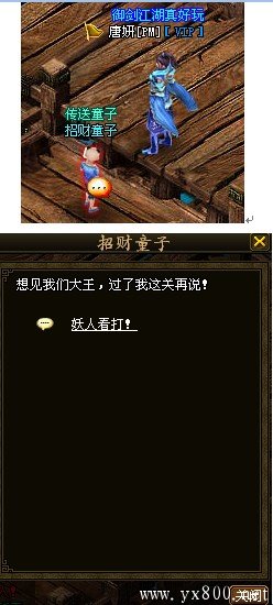 2、清完所有小怪后,与地图左下角招财童子NPC对话,选择妖人看打!