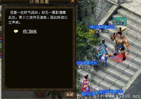 活动开始后,会出现全服滚动系统公告,这时随机一个门派中,会出现6个江湖恶霸NPC。对应公告门派职业的玩家可以作为队长,组成一支3人以上的队伍,在相应的门派中找到江湖恶霸,与其对话选择师门除叛,就可以进入副本进行剿灭战。