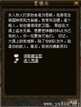 1、与江陵贾镖头、开封甄镖头对话,选择副本—荒漠宝藏。