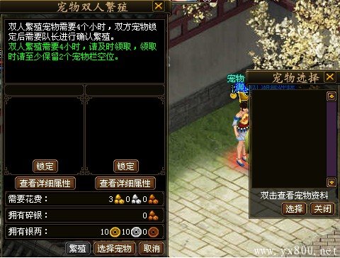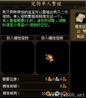 玩家还可以选择自行繁殖宠物。使用宠物笼将会一次性获得两只特定宠物,性别一雌一雄。不同等级的宠物笼开出的宠物等级也不同。配合准生证,就可以进行单人繁殖。繁殖和领取宠物时请至少保留4个宠物空位。繁殖需要2小时。