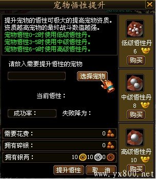 当宠物悟性为6,7,8,9时,可使用高级悟性丹来提升悟性。