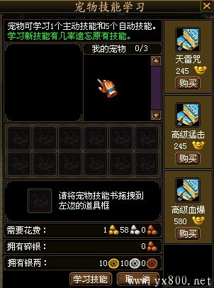可以在宠物使者处升级宠物技能:吸血、寒冰咒、烈火咒、血毒咒、玄雷咒、吸气、打怒、猛击、连击、痛击