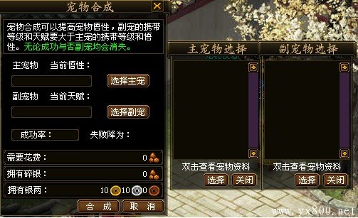 除了通过提升宠物悟性来提升宠物资质外,还可以通过宠物合成来提高原有宠物的资质。其中,用来作为材料的副宠物等级需要大于30级,且其天赋比主宠物当前悟性高。每次宠物合成有一定几率失败,每失败一次,下次提升成功率加成2%。无论合成是否成功,副宠物都会在合成结束后消失。