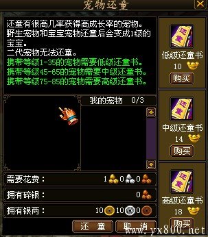 将可携带等级1-45级的宠物还童成为新生的宠物宝宝,还童后的宝宝有机会具有较高的成长率。