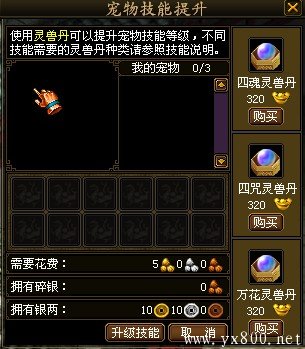 该技能可以在宠物商人处,使用万花灵兽丹进行升级。 |