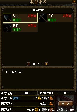 点击自己所需的技能学习即可。可以学习的技能一共有伐木、采矿、狩猎三种,学习1级的技能后,再升级需要采集熟练度、经验和金钱。