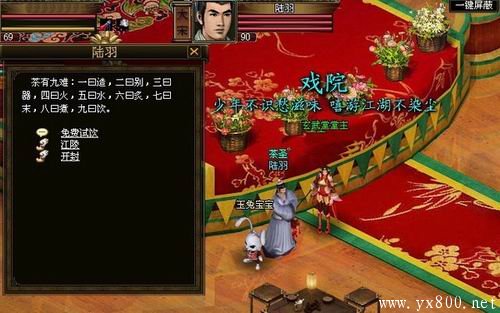 而与饮酒不同,随着御剑江湖古典戏院的开启,习惯了打打杀杀,大口吃肉大碗喝酒的英雄豪杰们也将会体验到古典江湖中听戏品茶的逍遥自在。在御剑江湖中的戏院可以从江陵或者开封中的戏院NPC中进入。而在戏院所谓的品茶听戏陶冶情趣,细数江湖趣事之外,最重要的其实还是经验的获取。也算是行走江湖的一个重要修行,毕竟中国自古以来就有的六艺之论,礼、乐、射、御、书、数。